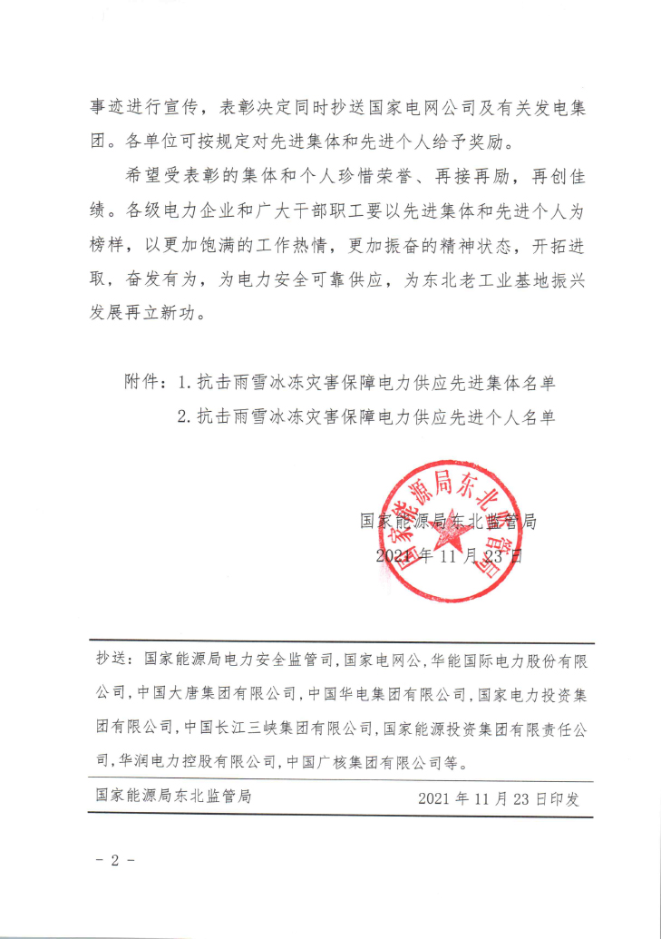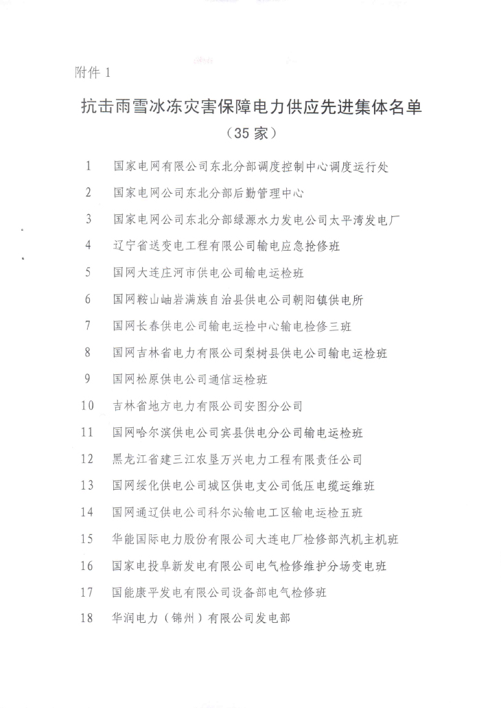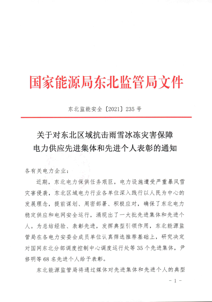 关于对东北区域抗击雨雪冰冻灾害保障电力供应先进集体和先进个人表彰的通知