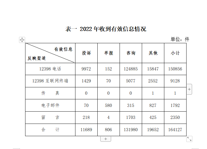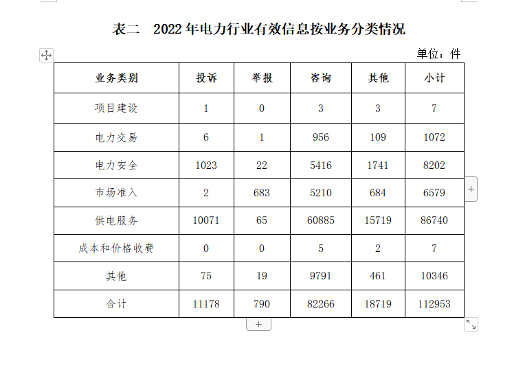 按诉求性质分类,投诉11689件,占有效信息的7.12%;举报806件,占有效信息的0.49%;咨询131980件,占有效信息的80.41%;表扬、求助、建议等其他方面19652件,占有效信息的11.97%。 按反映渠道分类,12398电话150856件,12398互联网终端9128件,传真1件,电子邮件1792件,留言2350件。 二、分类情况 2022年收到的有效信息中: 电力行业排在首位,有效信息数量为112953件,占全部有效信息的68.82%。群众关注的内容主要集中在供电服务、电力安全、市场准入等方面。(2022年电力行业有效信息按业务分类情况见表二)