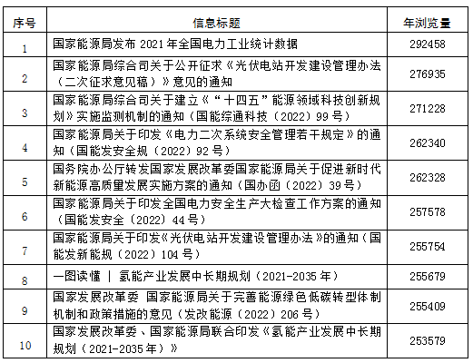 一、信息发布情况 2022年,国家能源局门户网站共加载信息2258篇。发布新闻通稿、图片新闻等206篇;发布政策文件76篇、政策解读21篇;常态化维护“一带一路能源合作”等9个专题专栏。全年开展意见征求13次、公示调查15次,累计受理网民留言1900条,相关部门及时公开反馈情况,反馈率达到100%。 二、网站访问情况 2022年,国家能源局门户网站访问量222,270,789次,访客数44,625,286人。从阅读排行看,关注度最高的3篇信息为《国家能源局发布2021年全国电力工业统计数据》《国家能源局综合司关于公开征求<光伏电站开发建设管理办法(二次征求意见稿)>意见的通知》《国家能源局综合司关于建立<“十四五”能源领域科技创新规划>实施监测机制的通知》(国能综通科技〔2022〕99号),年浏览量分别为292458、276935和271228,详见下表。从站内搜索看,“能源规划”“新能源”“风电”“输配电”“特高压”等成为高频词汇。光伏电站开发建设管理办法(二次征求意见稿)>